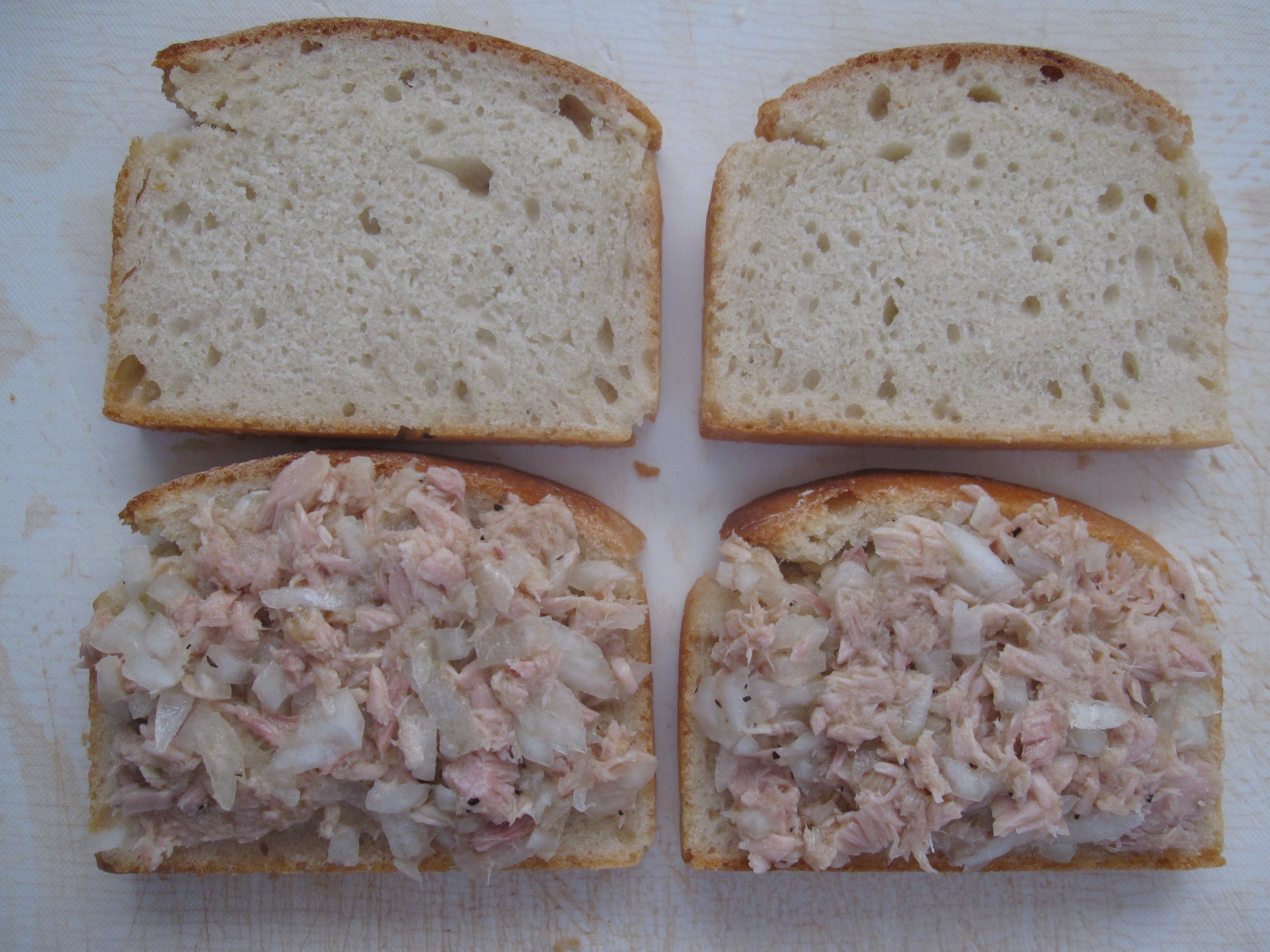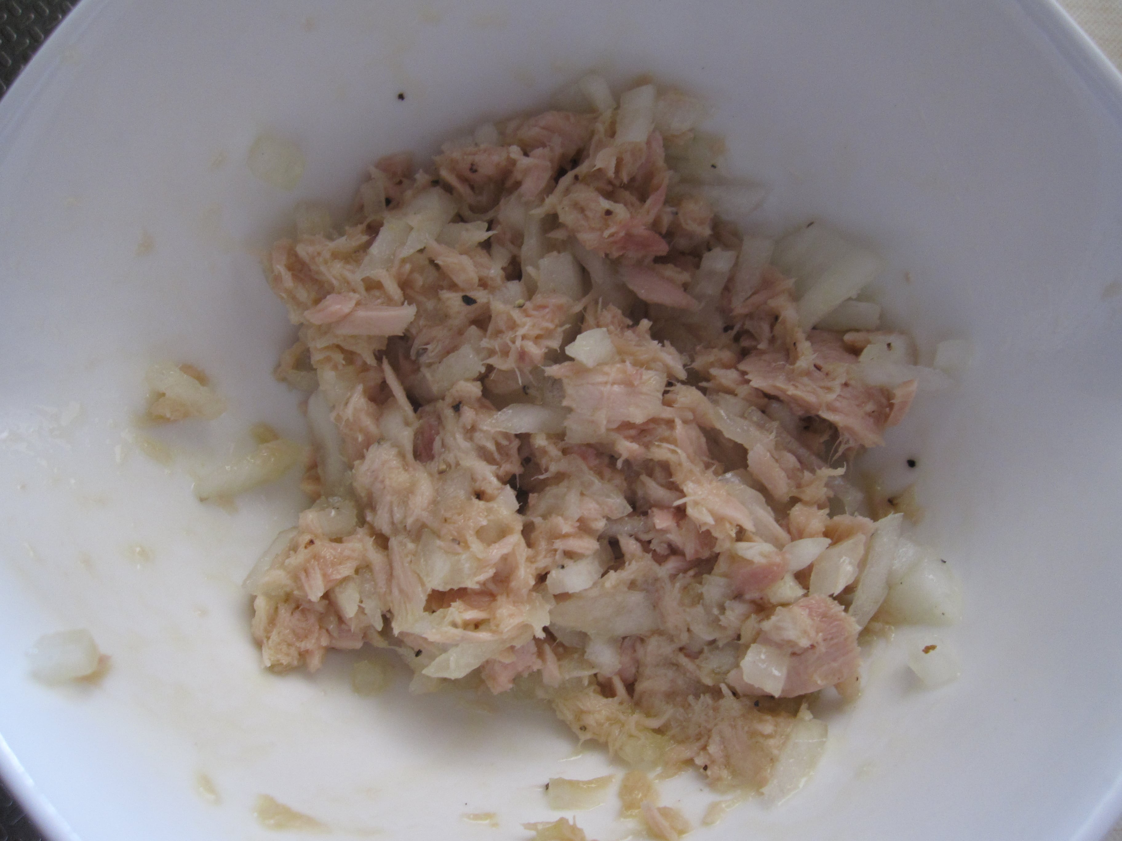 食パン、ツナ缶、オリーブオイル、玉ねぎ、塩、ブラックペッパー