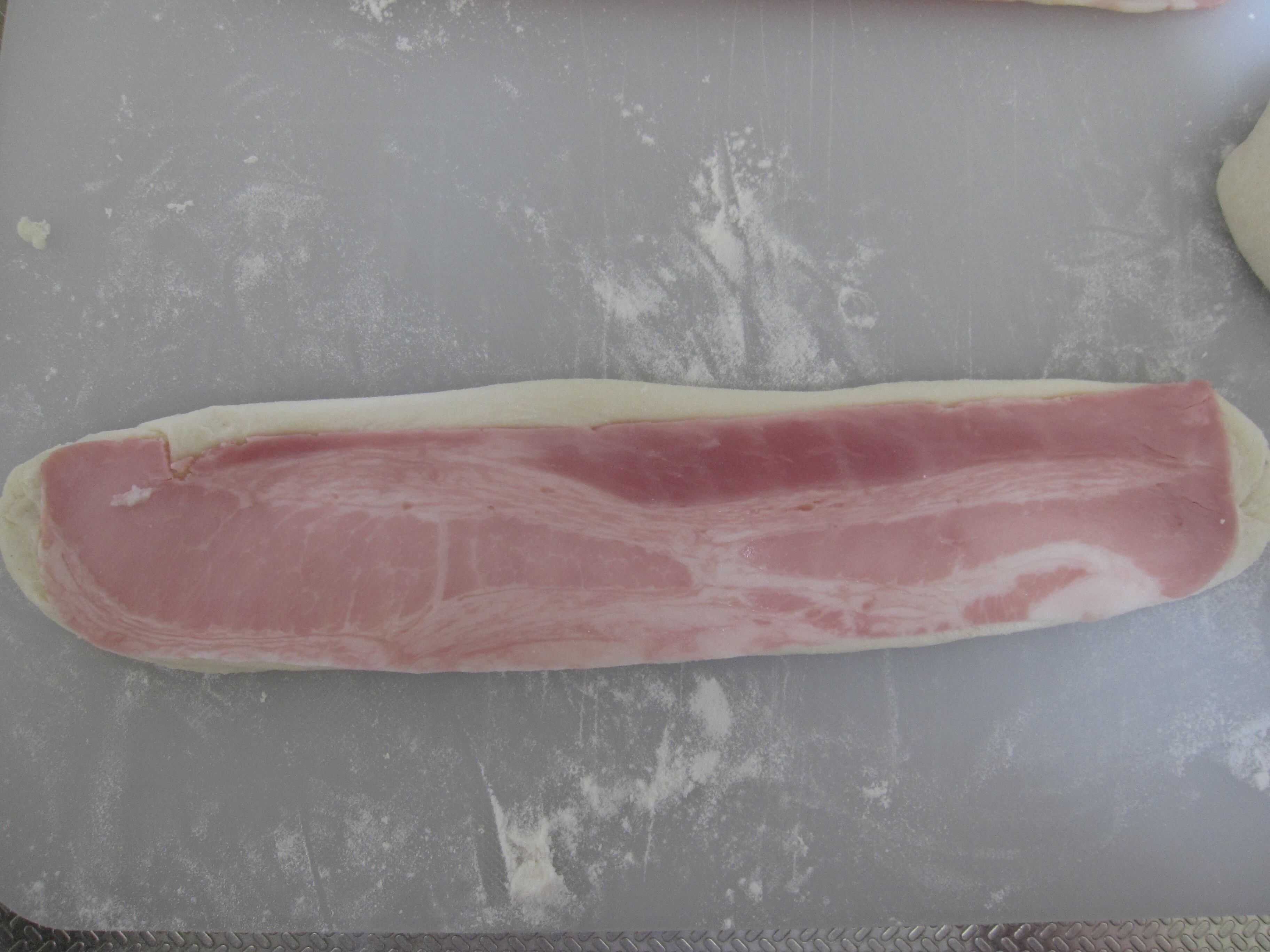 フランスパン生地でベーコンを1枚ずつ包んで、麦の穂の形にカットします。
